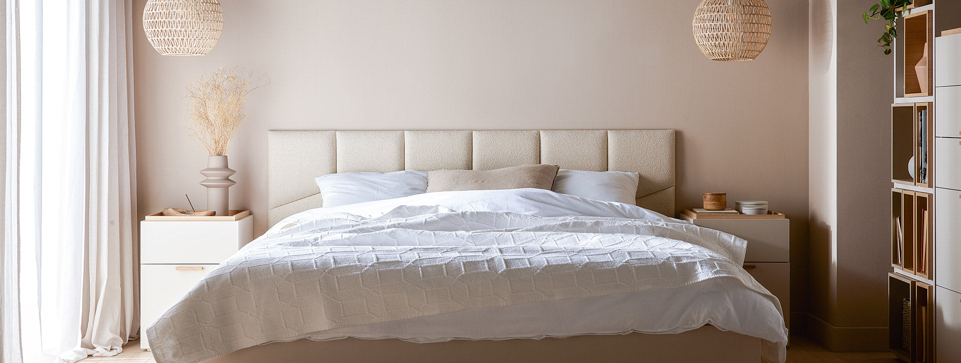 - Tapicerowana dekoracja w kremowym kolorze o ciekawej supełkowej fakturze boucle może pełnić rolę przyjemnego w dotyku wezgłowia łóżka, miękkiego oparcia dla pleców czy ozdobnego wykończenia wnęki.