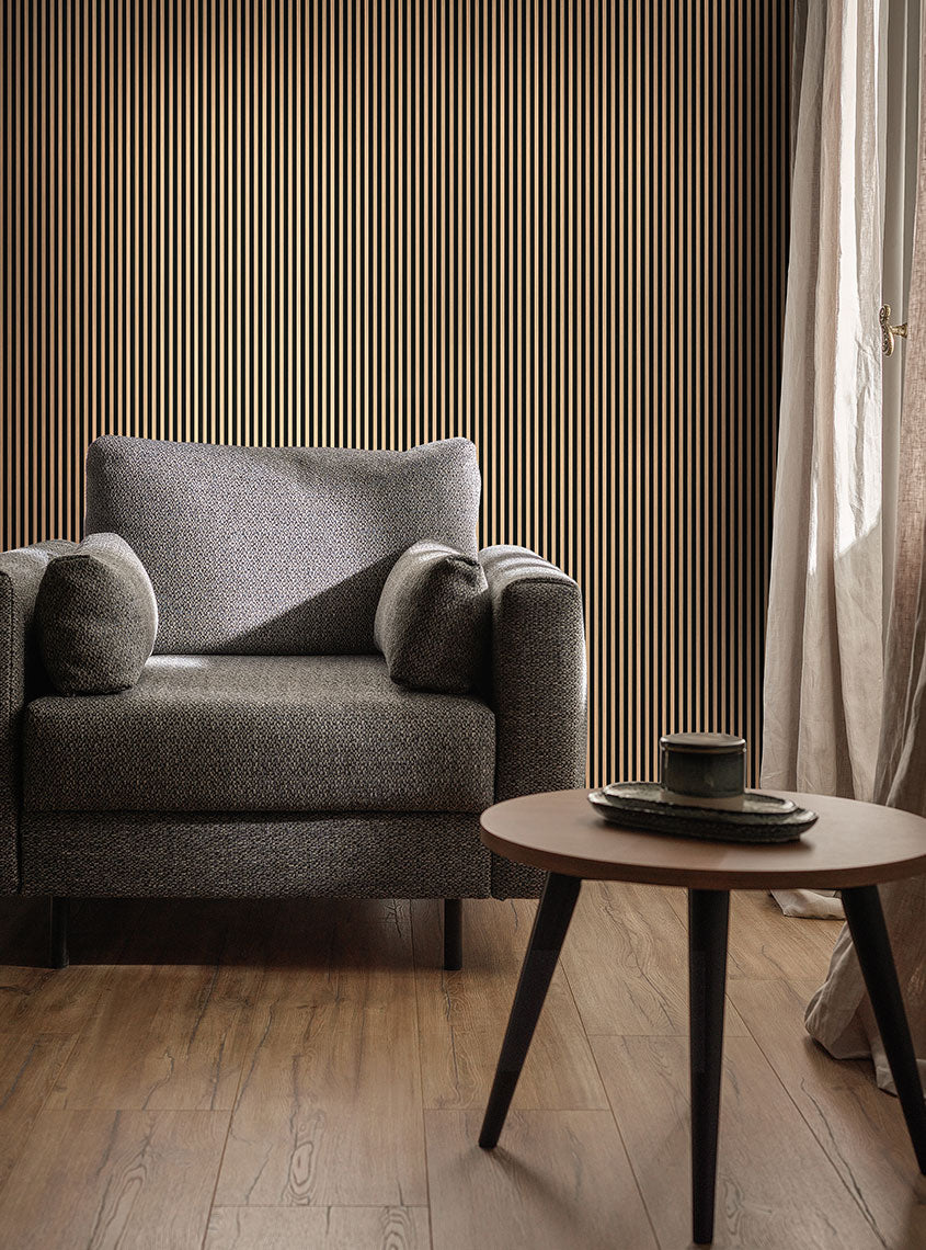 Panele lamelowe Linerio S-Line Natural Black sprawiają, że pomieszczenie wydaje się wyższe i bardziej przytulne. Pomagają wyróżnić konkretną strefę we wnętrzu i wyciszyć przestrzeń. Cienkie lamele w kolorze jasnego drewna można zastosować również w przedpokoju czy kuchni. Powstały z nowoczesnego materiału, dzięki czemu są trwałe i lekkie.